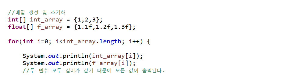 일단 for문의 기본적인 이용 방법이다. for문은 초기화와 조건식을 통해 참과 거짓을 가려내는 과정을 한번 거치게 된다. 만약 여기서 참이 나오면 중괄호 영역에 쓰인 구문이 실행되고 증감식으로 돌아가 변수의 값을 증가시키거나 혹은 감소시키게 된다. 그러고는 다시 조건식으로 넘어가 증감식을 거친 변수의 값에 따라 참과 거짓을 가려내고 다시 참일 경우 실행, 증감, 조건식 비교, 이 과정을 거짓이 나올 때까지 반복한다. 그래서 반복문이라고 불리는 것이다. 그렇다면 조건식 비교문에 배열이 가진 주소길이 만큼 지정할 수 있다면 활용하는 게 가능하지 않을까?