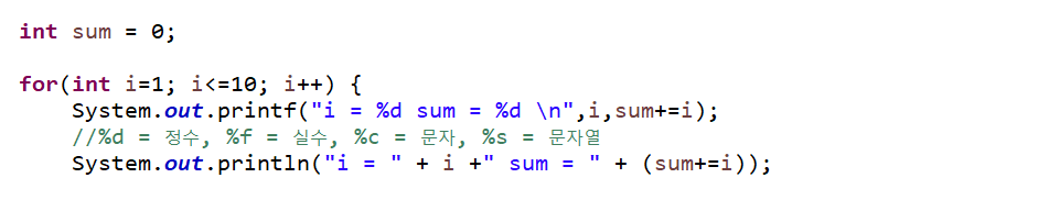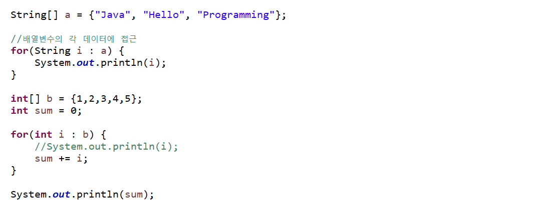 자바스크립트에서는 forEach문이라고 따로 썼는데 자바에서는 for문과 똑같이 적어주면 된다. 다만 식이 다를 뿐인데, 먼저 받아 올 데이터의 타입을 적고 임의 변수를 선언한다(꼭 i가 아니어도 된다! for문도 그렇다). 그런다음 콜론을 찍고 배열 변수명을 적어주면 알아서 변수 안에 들어있는 값이 foreach에서 선언한 변수에 담기며 구문을 실행하게 된다. 언제까지? 변수가 가지고 있는 값을 모두 쓸 때까지. 따로 조건식을 쓰지 않아도 알아서 배열변수의 길이만큼 스스로 동작하는 것이다. 이렇게 기능을 돌리면 첫 번째 foreach문에서는 Java Hello Programming 이라는 글자가 공백마다 줄이 바뀐 채 출력되고 두 번째 foreach문에서는 변수에 담긴 모든 값이 더해진 15가 화면에 출력된다.