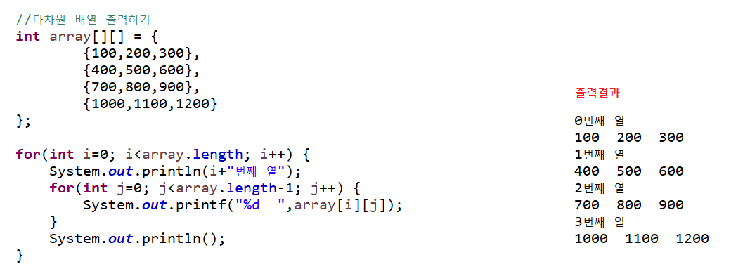 배열의 크기를 미리 주는 방법도 있겠지만 일단 초기화를 동시에 해주는 방향으로 작성해보았다. 스스로 4열 3행을 쓴다 생각하고 모든 값을 화면에 출력하는 반복문도 작성했는데 이해한 것이 맞았는지 출력하는 데 문제가 없었다. 일단 기본적으로 배열의 길이는 1차원일 때의 기준인 가로, 즉 열을 기준으로 잡는다. 나는 4열을 기준으로 작성하였으니 길이는 4, 행은 3으로 잡았기 때문에 해당 배열의 길이에서 -1한 값을 두번째 for문의 조건으로 삼았다. 이렇게 쓰는 for문을 중첩 for문이라고도 한다.