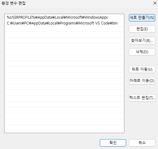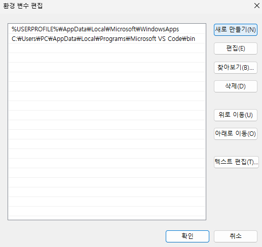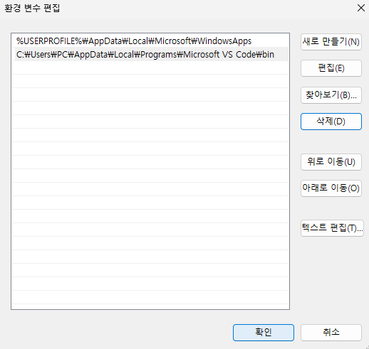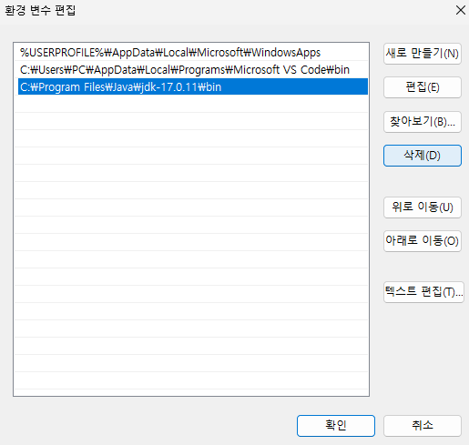 다시 시스템 환경 변수 편집에 들어가 Path에 추가했던 파일 경로를 삭제한다.
