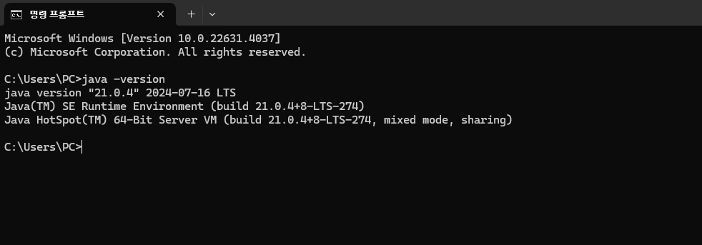 창에 java -version을 입력하자 17버전을 인식하는 것을 확인할 수 있다.