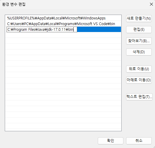 새로 받은 JDK의 bin파일 위치를 Path에 새로 만들어준다.