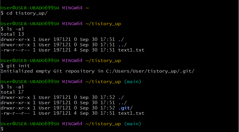 | ~/tisutory_up (main) | 깃이 생성되며 main 브랜치로 지정된 상태다. 앞으로 해당 위치에 새로운 파일이 나타나면 이를 감지하거나 파일의 변동사항을 추적하여 명령어를 통해 사용자에게 알려줄 수 있다. |