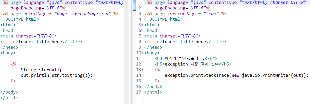 조금 주의 깊게 살펴봐야 될 부분은 예외처리 페이지이다. errorPage 속성은 해당 페이지에서 에러가 발생했을 경우 예외처리를 위한 에러 페이지 위치를 지정해 주는 것이고, isErrorPage는 그 에러 페이지를 지정하는 것이다. 물론 지정하지 않아도 경로만 잘 설정했다면 굳이 지정해주지 않아도 되지만 isErrorPage를 설정하는 이유는 true 지정 시, exception 변수를 사용할 수 있게 되기 때문이다.