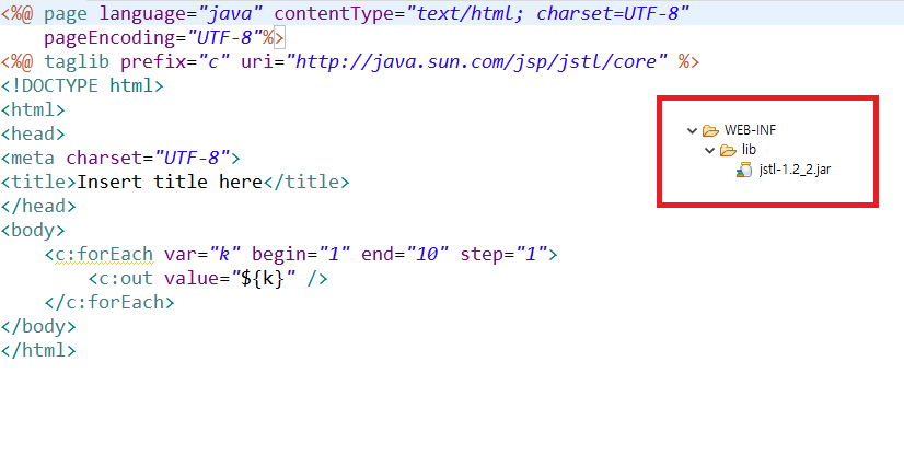 taglib은 사용자 정의 태그(라이브러리)를 설정할 수 있는데, java언어도 사용할 수 있는 jsp파일에서 html태그로 특정 함수를 표현할 때 사용된다. 이 태그를 사용하기 위해서는 WEB-INF의 lib폴더에 jar(java파일 묶음) 라이브러리 파일이 있어야 사용할 수 있다.