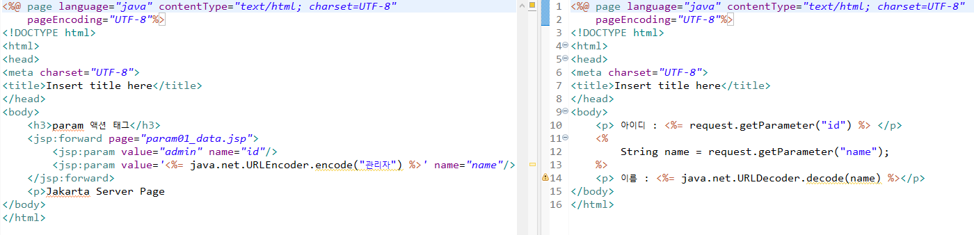 param 태그는 현재 페이지에서 발생된 값들을 다른 페이지에 전송하고자 할 때 사용되는 액션태그다. 앞서 forward와 include 태그는 지정된 파일경로로 이동한다고 했는데, 그들의 종결어미 사이에 param 태그를 사용하게 되면 이동할 때 지정된 값을 가지고 해당 페이지로 넘어갈 수 있다. 즉, 파라미터 전송이 가능한 형태가 된다. 실습에서 forward를 사용하여 넘어갈 페이지에 param 태그를 사용하여 값을 지정해보았다. name은 쉽게 말해서 변수, value는 값인데 키 : 밸류로 저장되는 맵과 유사한 방식으로 저장된다. 여기서 id는 admin, name은 함수를 사용하여 관리자라는 값을 할당했는데 여기서 바로 문자열을 쓰지 않고 URLEncoder를 쓴 이유는 JSP간에 값을 가지고 이동하다 보면 문자 같은 경우는 원 데이터가 손실 날 가능성이 크기 때문이다. 따라서 인코딩과 디코딩을 통해 해당 값을 보호처리 하는 것이 안전하다.