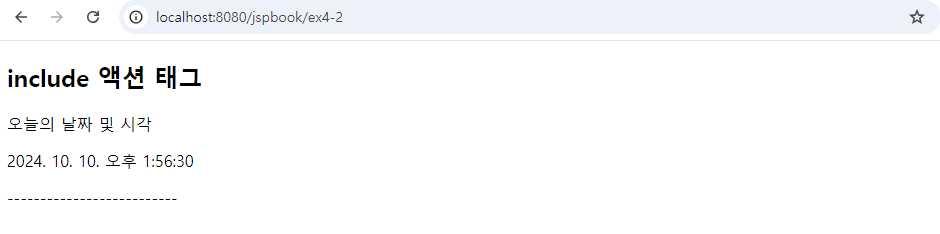 디렉티브 태그에서도 사용되었던 include는 액션 태그에 오면서 그 용도가 살짝 다르다. 먼저 해당 페이지에 다른 페이지의 내용을 삽입하는 것 까진 동일하나, 디렉티브 태그에서는 그저 코드 소스를 복사하여 붙여넣는 방식이었다면 액션 태그는 해당 페이지의 내용을 번역하여 나온 값을 들고와 해당 페이지에 출력하여 붙여넣는다. 즉, forward처럼 아예 이동을 하기 때문에 데이터 처리를 다른 페이지에서 처리할 수 있다. 즉, 이후 작성할 param 액션 태그를 활용하여 파라미터를 다른 페이지에 넘길 수 있는 것이 가능한데, 이렇게 되면 좀 더 동적인 웹페이지를 제작할 수 있게 된다.