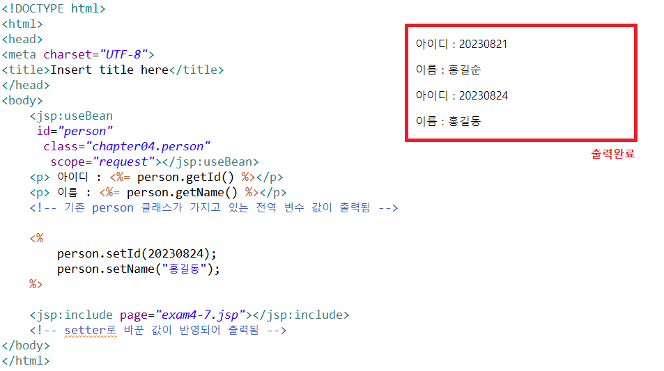 여기서 주의할 점은, 생성할 때 파라미터를 받지않는 기본 생성자가 있어야 useBean으로 객체 생성이 가능하다. scope는 해당 객체가 언제까지 사용될 지 예상하여 유통기한을 부여하는 것과 같은데, 사용되는 속성으로는 page(해당 페이지 내에서만 사용), request(1회 이동까지 사용), session(세션이 만료될 때까지 사용), application(서버가 닫힐 때까지 사용) 가 있다.