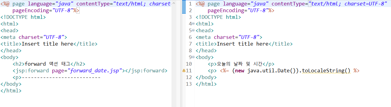 | <jsp:forward ... /> | 같은 서버 내에서 다른 페이지로 이동하여 해당 화면을 출력한다. |