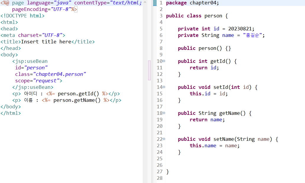 jsp에서 객체 생성을 한 뒤 변수의 값을 불러오기 위해 미리 person이라는 클래스를 만들고, useBean을 통해 person이라는 변수에 해당 클래스의 주소를 저장하였다. 사용 범위를 request로 지정하여 한 번의 이동 후에도 사용할 수 있게 하였고, 당장은 이동 없이 해당 페이지에서 person.get()함수를 통해 private로 접근이 제어된 상태인 변수의 값을 호출하는 것을 확인할 수 있었다.
