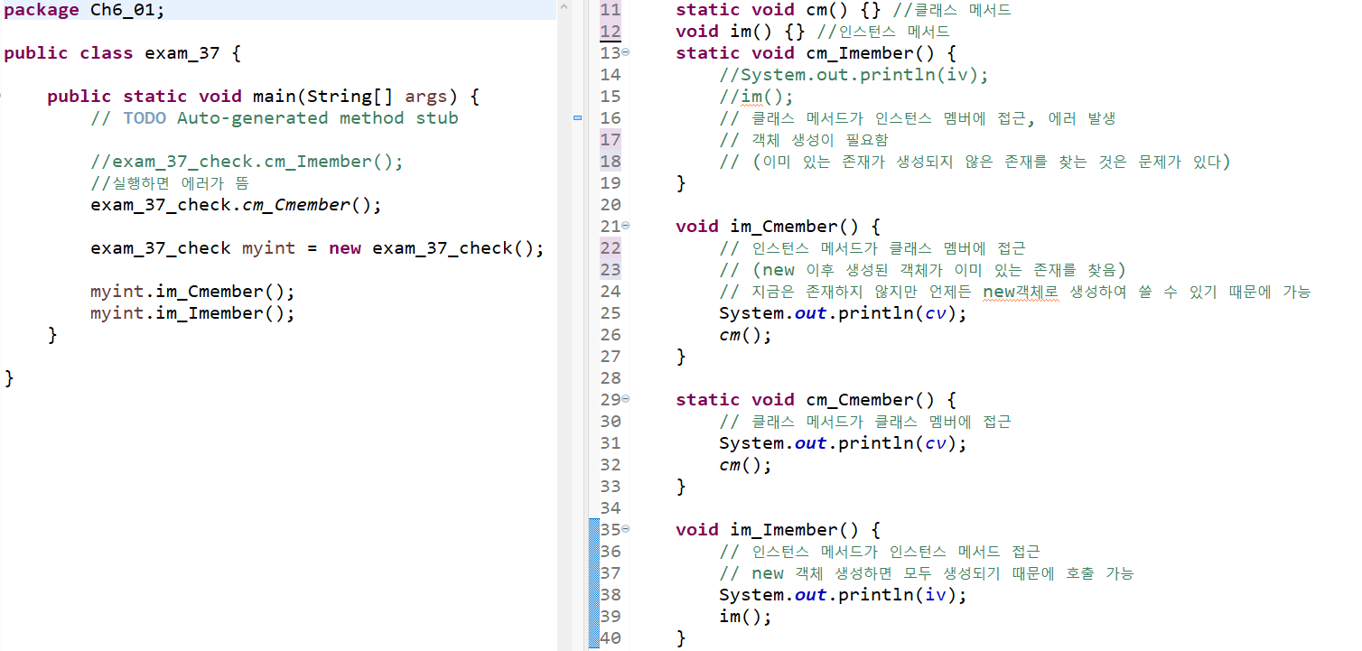 그렇다면 이제 인스턴스와 클래스에 대해 배운것을 종합적으로 정리해보겠다. 인스턴스 변수(혹은 함수)는 사용자가 new를 사용해 객체를 생성하기 전까지는 메모리에 존재하지 않기 때문에 static으로 선언된 함수에서 인스턴스 변수를 불러오면 에러가 뜬다. 이미 메모리에서 동작할 준비를 마친 함수 안에 선언되지 못한 인스턴스 변수는 존재할 수 없기 때문이다. 하지만 반대로 인스턴스 함수 안에 인스턴스 변수를 사용하는 건 가능하다. 어차피 둘 모두 new로 객체 생성을 선언하면 메모리에 같이 쓰여지기 때문이다. 이렇듯 둘 사이의 구조를 이해하는 것에 초점을 맞춘다면 변수에 관해서는 헷갈릴 일은 없을 듯 하다.