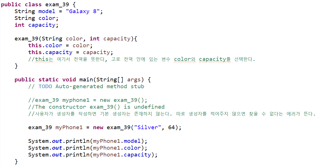 기본 생성자가 메서드라는 것을 알았다. 그렇다면 메서드가 가질 수 있는 매개변수를 통해 실제 인스턴스 변수에 값을 담는 것도 가능하지 않을까? exam_39라는 클래스 안에 세 개의 인스턴스 변수가 있다. 모델은 고정이기 때문에 변수를 선언함과 동시에 초기화를 진행했고, 나머지 두 값은 사용자의 데이터를 받기 위해 초기화를 진행하지 않았다. 그리고 메서드를 작성하는 것 처럼 클래스명을 메서드명으로 정하고 매개변수 값에 받을 데이터 타입과 변수명을 입력해준다.