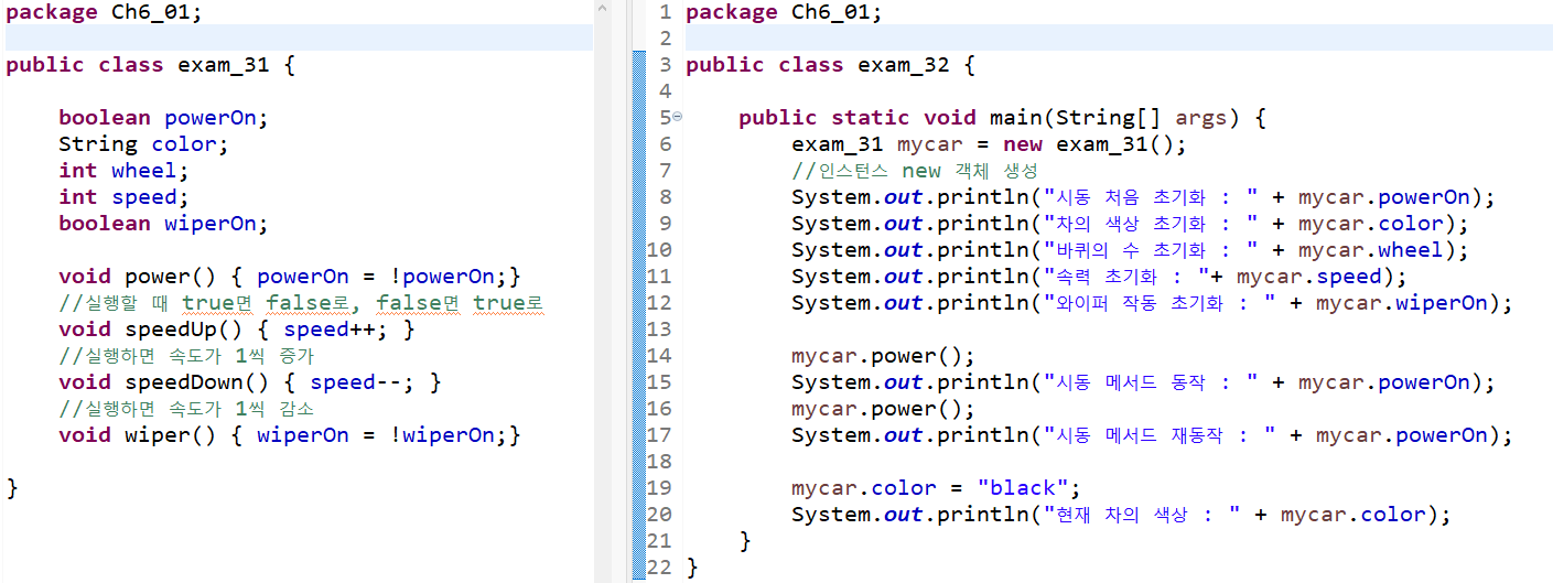 <인스턴스 생성 방법> 클래스 이름(데이터 타입) 참조변수명; 참조변수명 = new 클래스 이름( ); //new로 생성된 객체가 부여받은 주소를 참조변수에 저장 ex) exam_31 mycar = new exam_31( );
