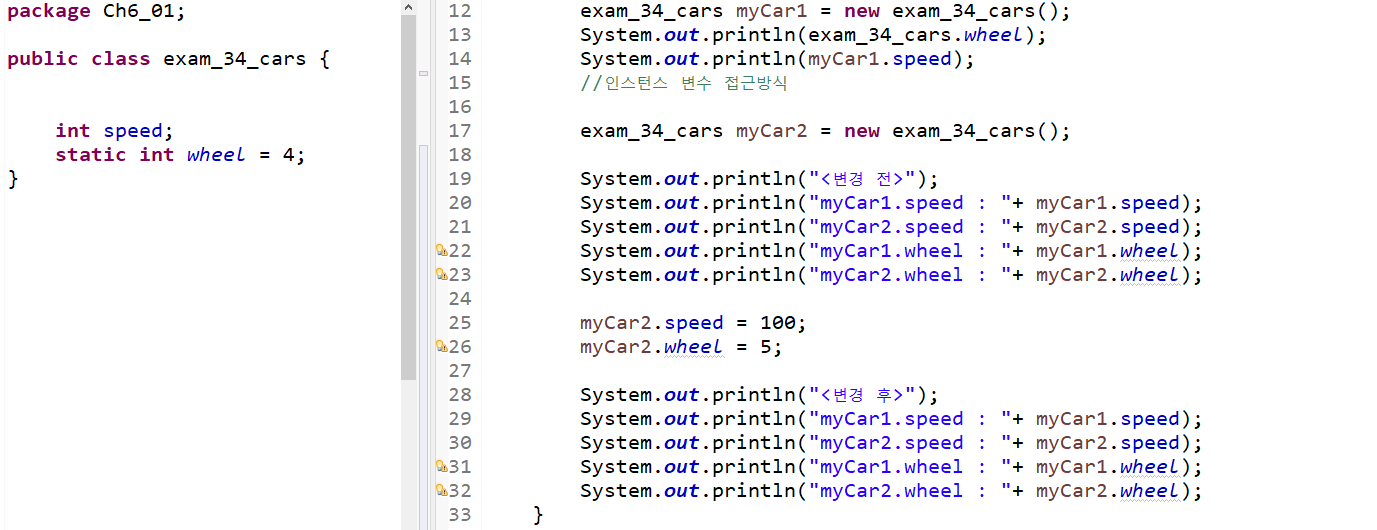 자동차의 속도는(speed) 각 인스턴스의 고유의 값을 가져야 하기 때문에 인스턴스 변수로 선언했고, 바퀴는 어느 인스턴스든 4개로 동일하기 때문에 static을 붙여 선언과 동시에 초기화를 했다. 이를 콘솔창에 나타내기 위해 가져오기 위해서 고유의 값을 가진 speed 변수는 인스턴스를 생성하여 불러와야 하지만, wheel 값은 이미 생성되어 메모리에 기록된 상태기 때문에 클래스명과 함께 변수를 불러오면 4라는 숫자가 콘솔창에 뜨게 된다. 물론 참조변수 내에서 불러오는 것도 불가능하지 않다. mycar2로 참조변수를 만들어 똑같이 불러내면 별 다른 오류 없이 작동하는 걸 확인할 수 있다. (어쨌든 해당 클래스에 부여된 속성이기 때문에 어느 인스턴스에서 호출해도 나오게 된다. 하지만 굳이 번거롭게 할 필요가 없기 때문에 클래스명으로 호출하는 것이 정석이다.)