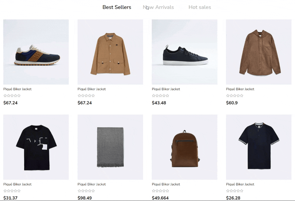 <section> <ul id="tap_list"> //상단의 탭이 될 부분 <li class="fashion_tab" id="ftap1">Best Sellers</li> <li class="fashion_tab" id="ftap2">New Arrivals</li> <li class="fashion_tab" id="ftap3">Hot sales</li> </ul> <div id="pro_list"> //하단의 컨텐츠가 나타나는 부분 <div class="pro_box1 pro_box2" id="pro1"> ... </div> <div class="pro_box1 pro_box3" id="pro2"> ... </div> <div class="pro_box1 pro_box2" id="pro3"> ... </div> <div class="pro_box1 pro_box3" id="pro4"> ... </div> <div class="pro_box1 pro_box2" id="pro5"> ... </div> <div class="pro_box1 pro_box3" id="pro6"> ... </div> <div class="pro_box1 pro_box2" id="pro7"> ... </div> <div class="pro_box1 pro_box3" id="pro8"> ... </div> //최대한 숫자를 활용하는 편이 편하다. </div> </section> |